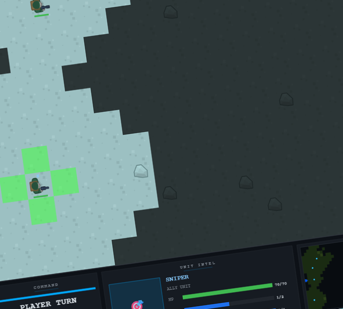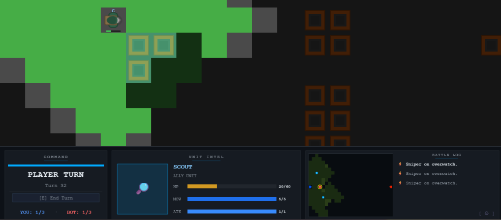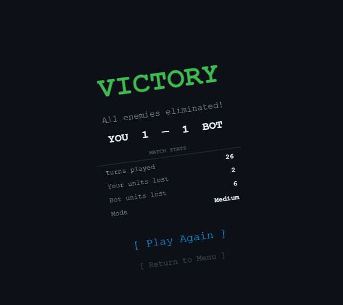 Command a squad of five unit types, manage fog of war, and outthink the enemy AI — or a friend in hotseat mode.
